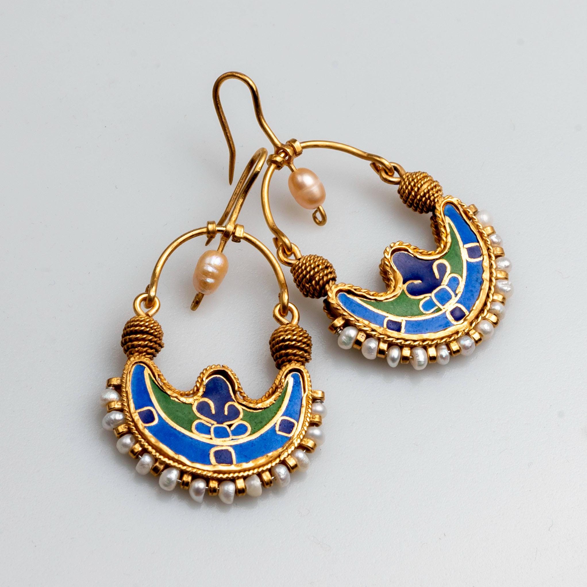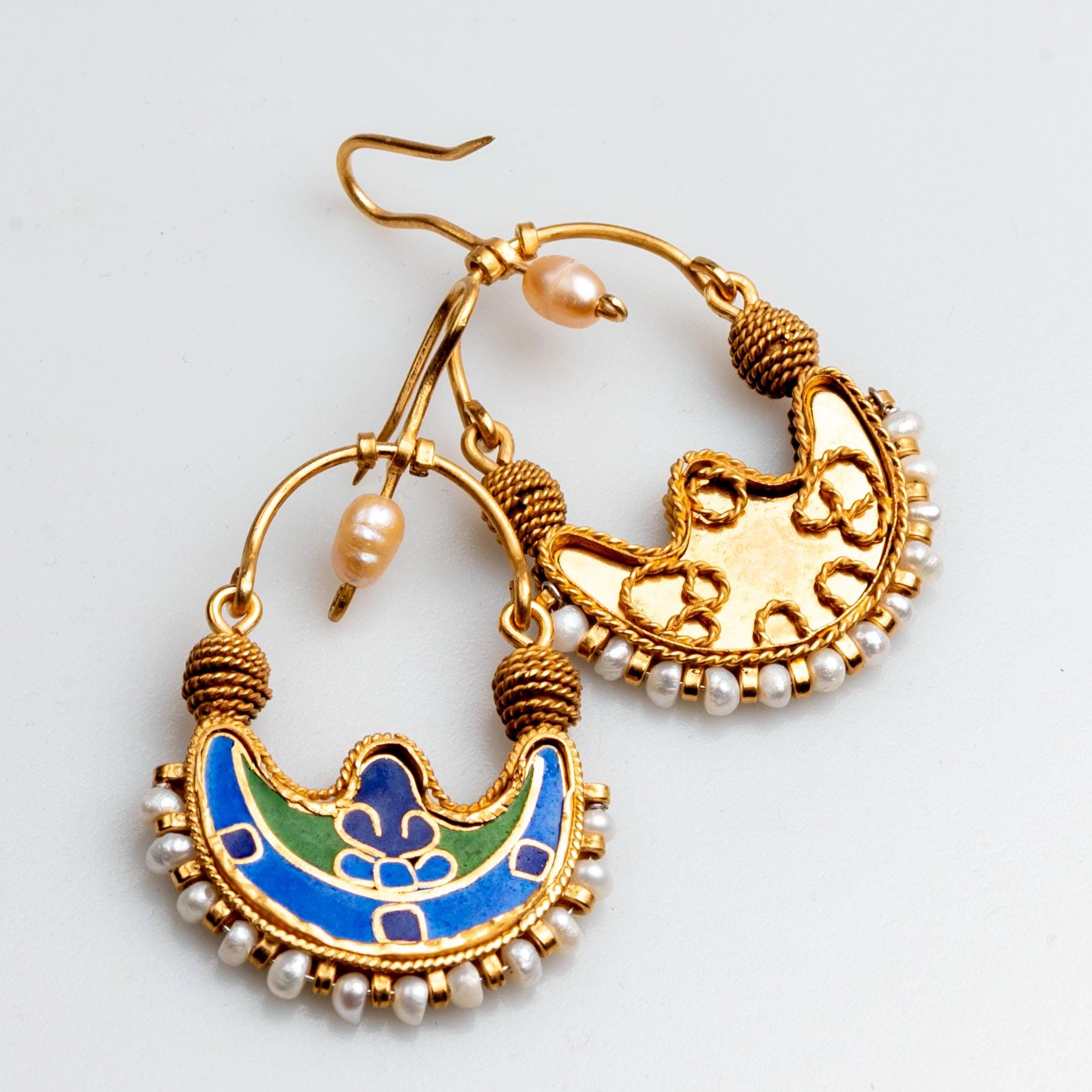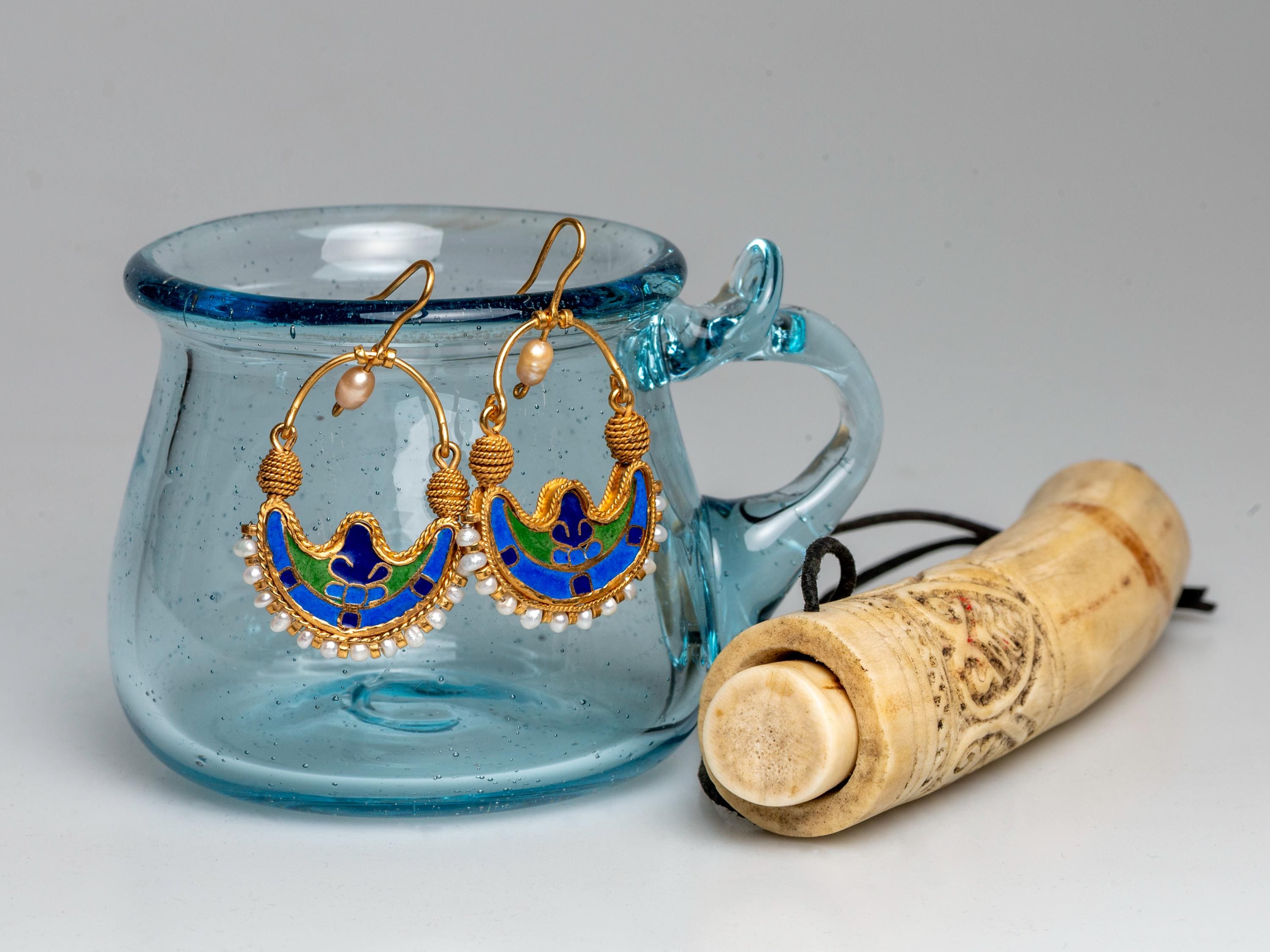 These handmade Byzantine earrings are a detailed replica of an 11th century treasure discovered in Bovlinge Jutland, Denmark. Crafted with gold-plated finish and vibrant enamel, they reflect authentic medieval Byzantine jewelry design. Perfect for history lovers, Viking era enthusiasts, and collectors of unique archaeological-inspired jewelry.
