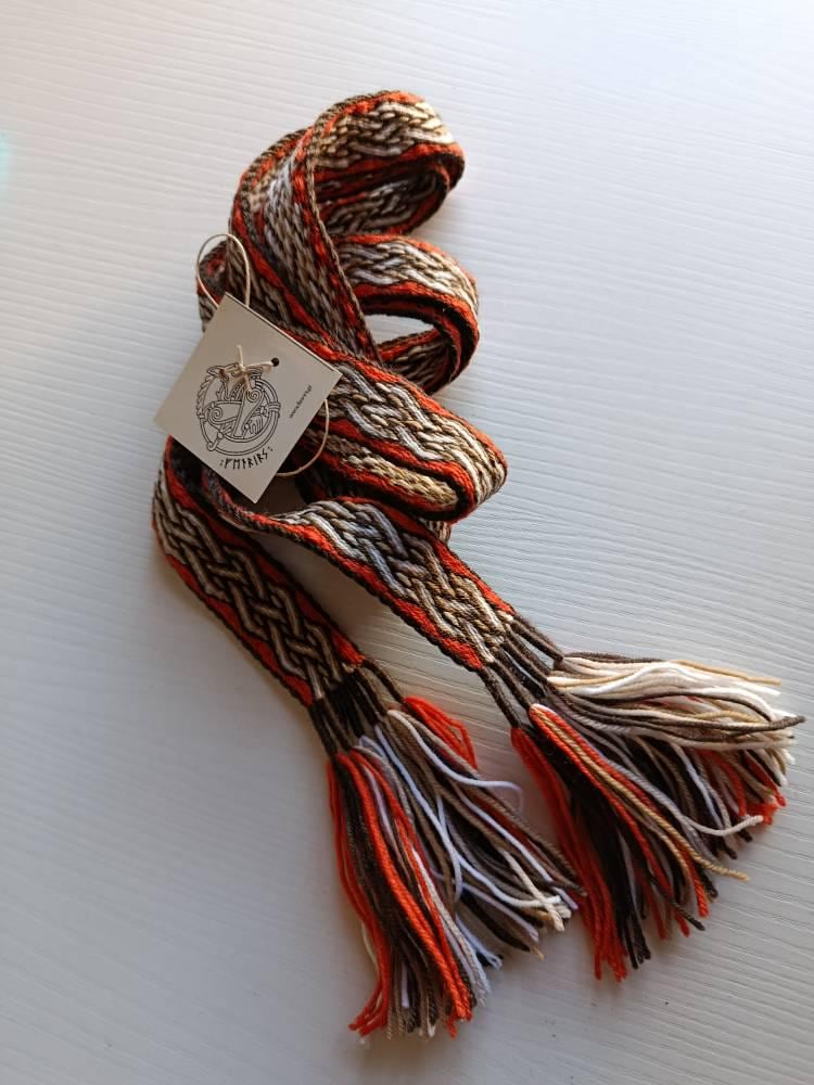 Hans made, woolen belt, strap, band made by using tablet waeving historic method for medival patterns.